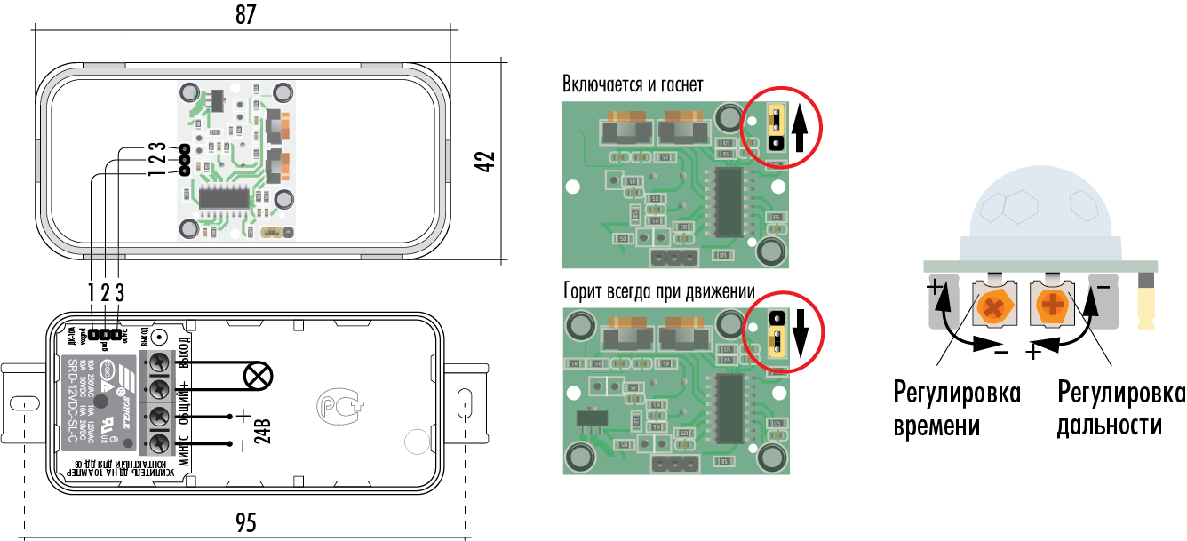 Режим H — при срабатывании датчика несколько раз подряд на его выходе (на OUT) остается высокий логический уровень. Короче, пока есть движение ― свет всегда горит!