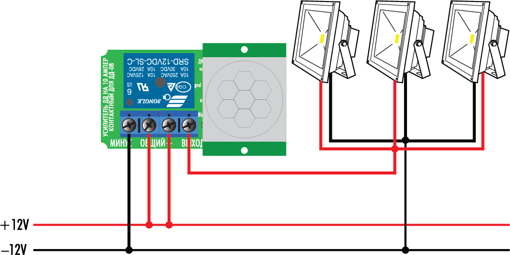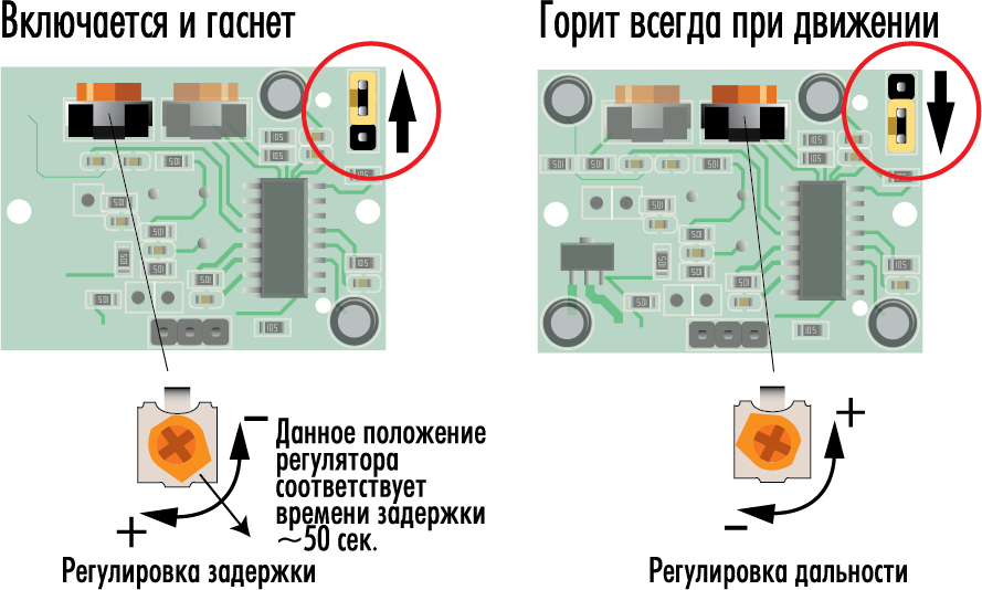 Режим H — при срабатывании датчика несколько раз подряд на его выходе (на OUT) остается высокий логический уровень. Короче, пока есть движение ― свет всегда горит!