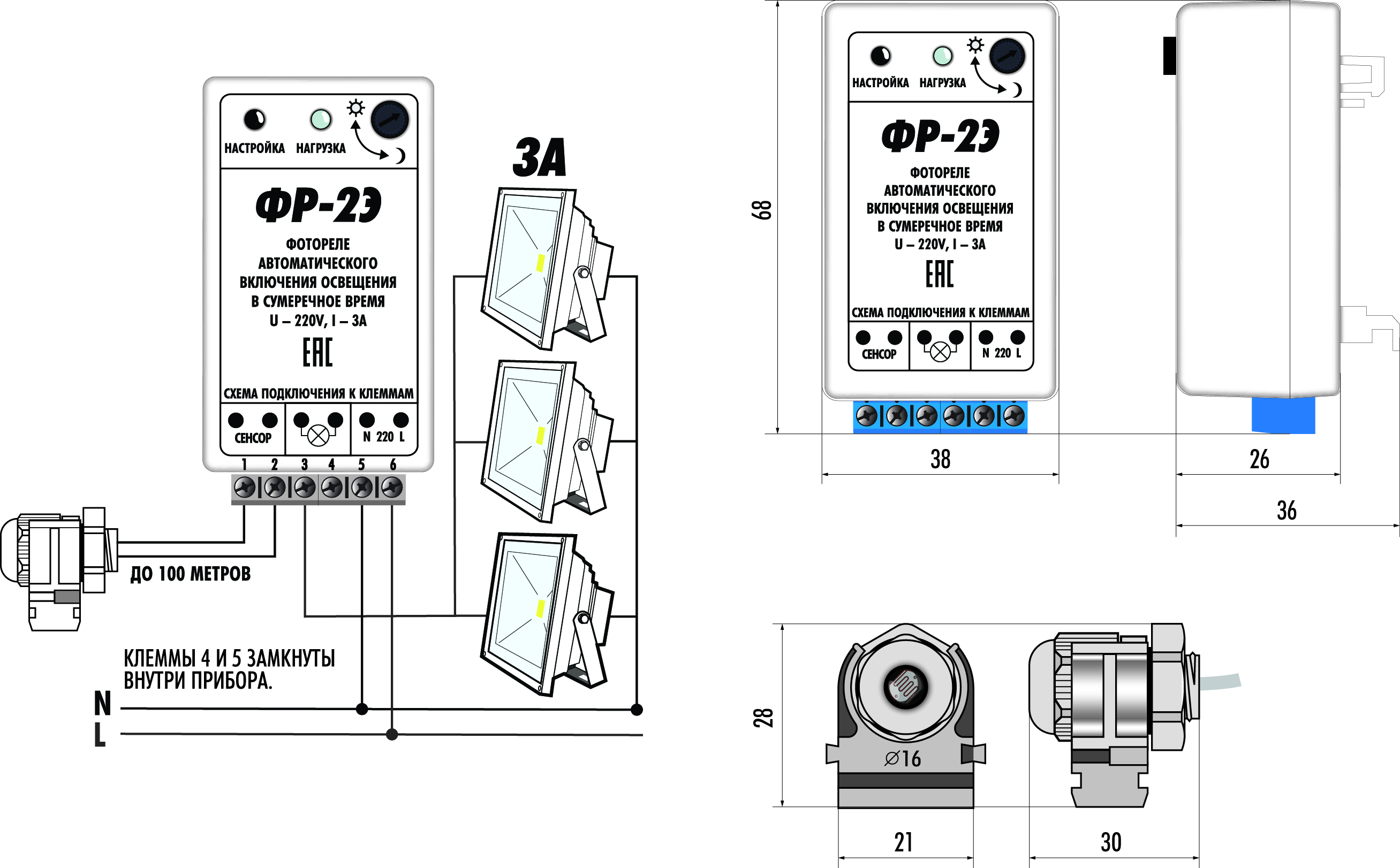 Фотореле выпускается в пластиковом корпусе с присоединением проводов питания, коммутируемых электрических цепей и гермосенсора на клеммы прибора.
