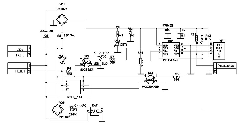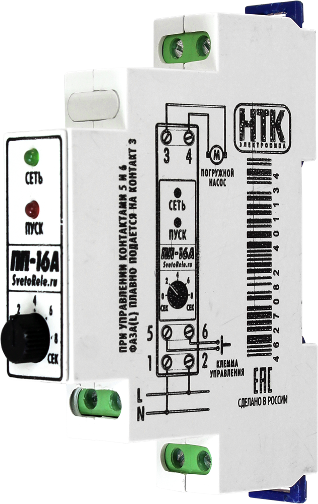 Подключите к клеммам 1 и 2 сеть 220 вольт, нагрузку на клеммы 3 и 4, а на клеммы 5 и 6 любые контакты от прерывателей, кнопок и др. Прибор распознает управление как кнопкой, так и переключателем - настройка не требуется.