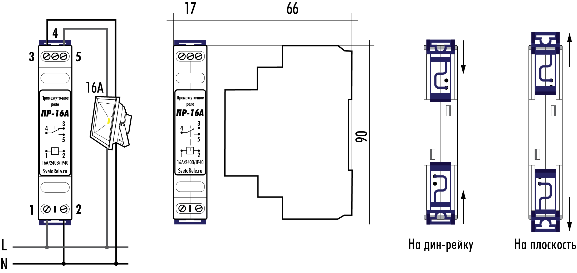 Реле применяется для увеличeния нагрузочной способности (малогабаритный контактор, усилитель мощности), использования в качестве промежуточных, а также для управления в цепи постоянного тока (гальваническая развязка). Реле выполнено в модульном корпусе и может устанавливаться на DIN –рейку 35 мм или на плоскость винтами или шурупами (с выдвинутыми замками крепления).