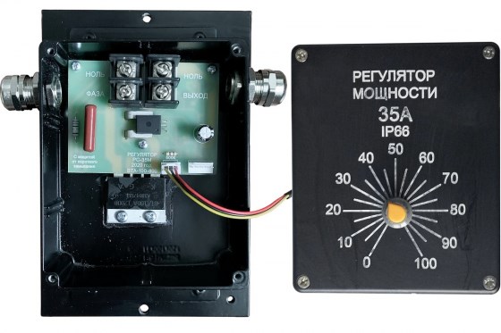 На крышке прибора установлен регулятор. Вращение по часовой стрелке увеличивает выходную мощность (до 100%), вращение против часовой стрелки уменьшает выходную мощность (до 0%). Для точной настройки предусмотрена шкала, пронумерованная от "0" до "100" с шагом 5 и 10 процентов. При установке стрелки регулятора, например, на "40", РС-35М урезает выходную мощность до 40%. При повороте с 0% происходит плавный пуск, что позволяет прогревать ТЭН постепенно, уменьшая пусковой ток холодных нагревателей.