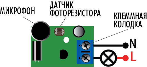 Подключается как обычный выключатель ― последовательно лампе. Устанавливая в светильник сделайте в нем необходимые отверстия для доступа света и звука, если света на датчик падает мало, освещение будет включаться в более ранее сумеречное время, если плохой доступ звука ― чувствительность микрофона падает. Возможно встраивать внутрь выключателя ― параллельно ему.