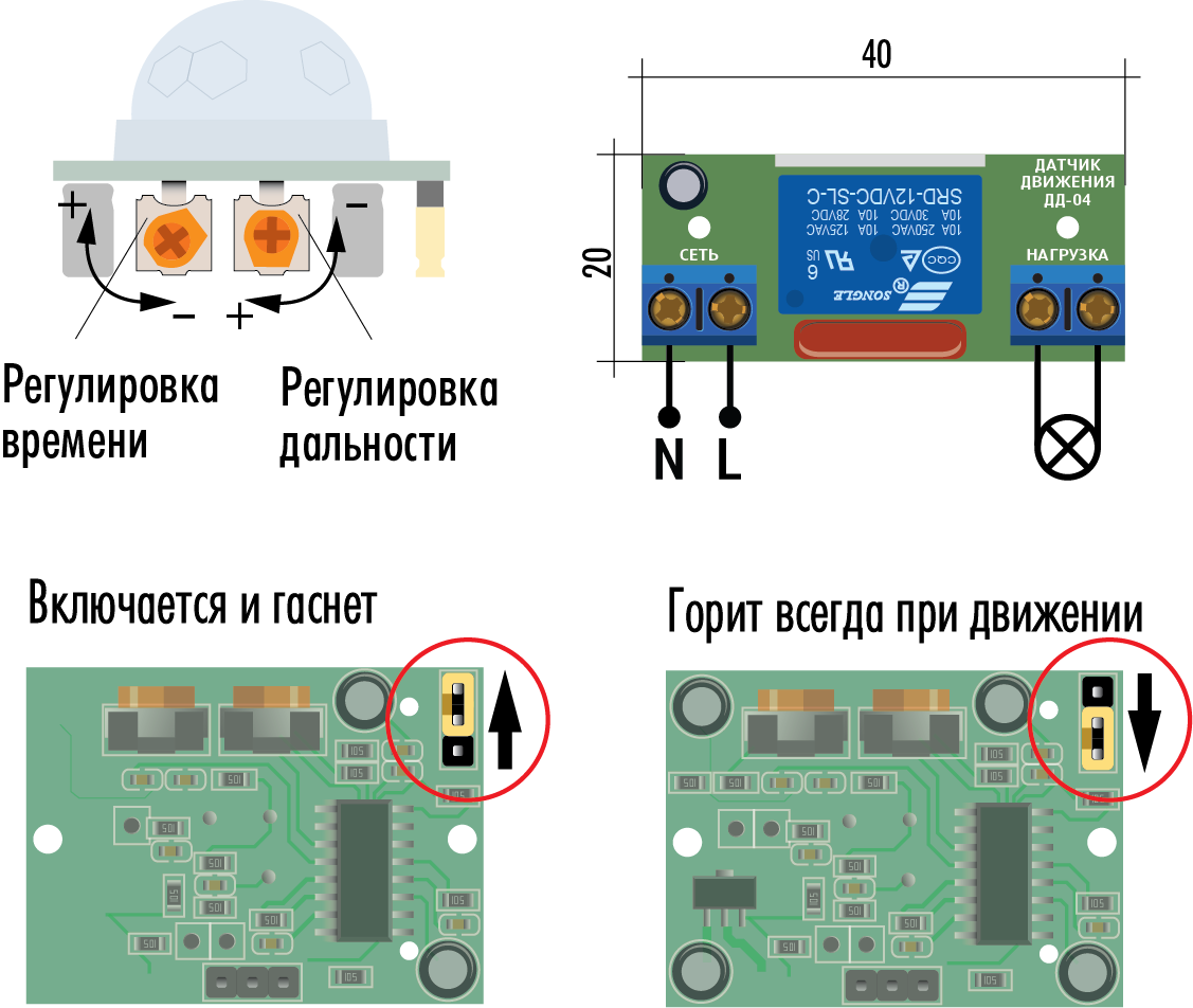 Режим H — при срабатывании датчика несколько раз подряд на его выходе (на OUT) остается высокий логический уровень. Короче, пока есть движение ― свет всегда горит!