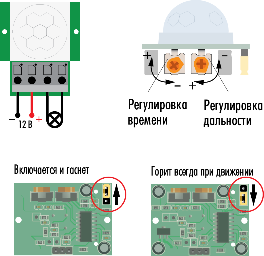 Режим H — при срабатывании датчика несколько раз подряд на его выходе (на OUT) остается высокий логический уровень. Короче, пока есть движение ― свет всегда горит!