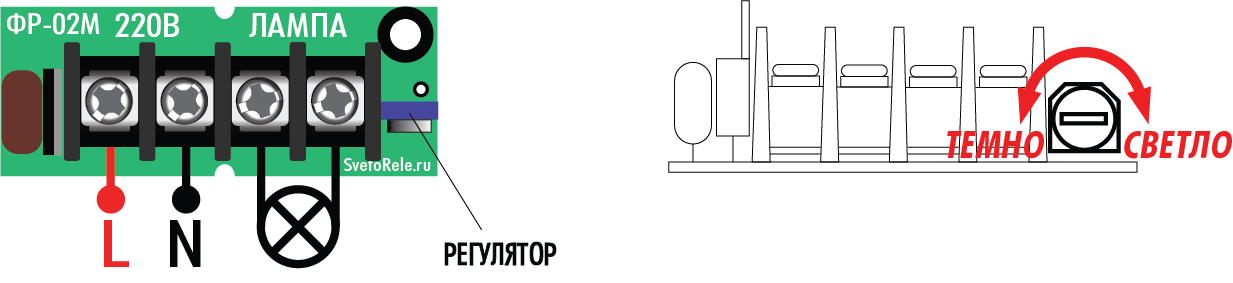 Задание порога освещенности производится поворотом регулятора. По часовой стрелке - порог выше, лампа включится раньше, когда еще не совсем темно. Против часовой стрелки - порог ниже, лампа включится позднее, в более темное время.