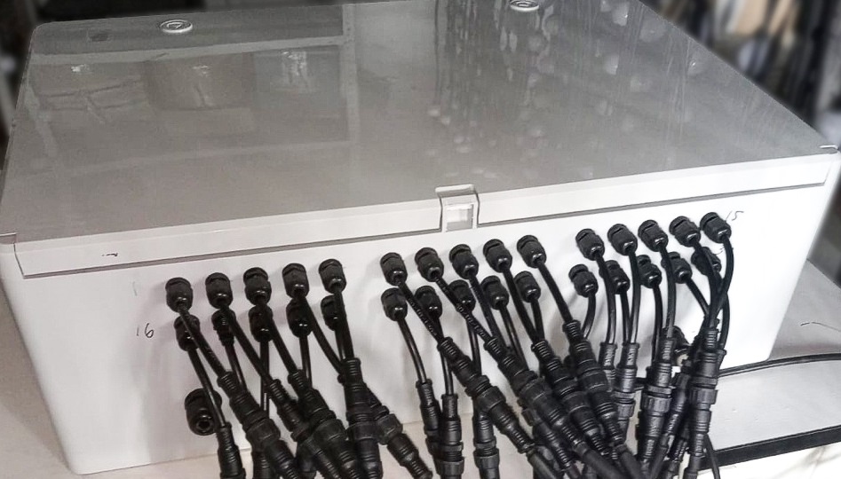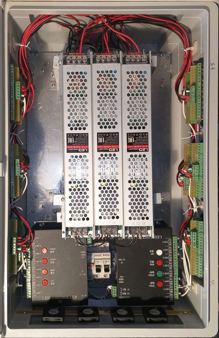 Выполнена вся коммутация с разъемами в герметичном шкафу расположенном внизу Елки. Все гирлянды взаимозаменяемы. Расстояние провода гирлянды от шкафа до первого шарика 4.2 метра.