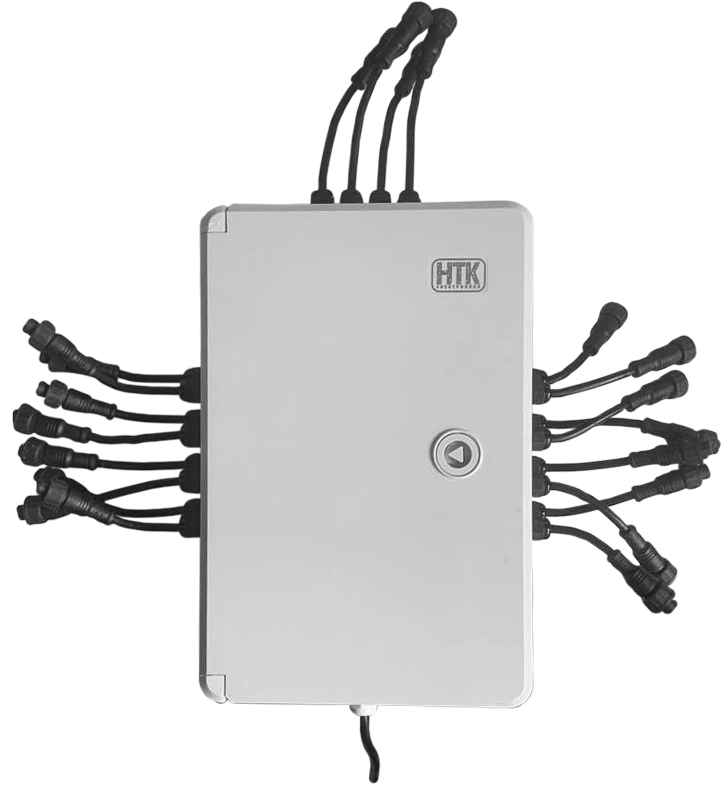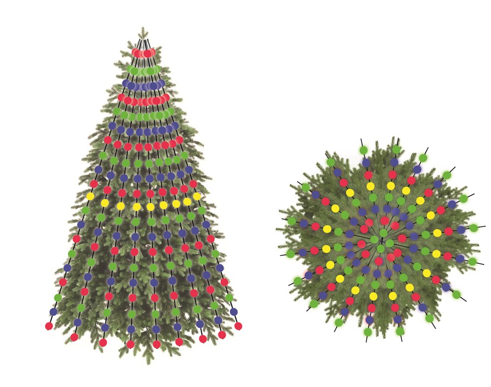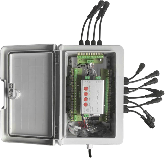 18 гирлянд с проводом 2.3 метра и разъёмами герметичными, корпус IP66 с контроллером SIT, блоки питания 3 шт. Выполнена вся коммутация для самостоятельного подключения на ель.