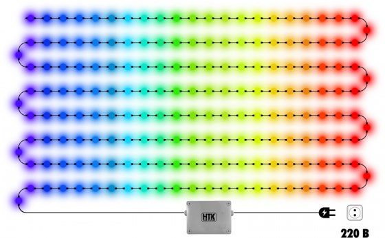 70 метров. RGB цифровая гирлянда светодинамическая, шары диаметр 50 мм угол 360 гр (1.44 Вт) IP54, расстояние между ними 23.5 см (от центра до центра шарика). Кол-во шариков 300 шт.