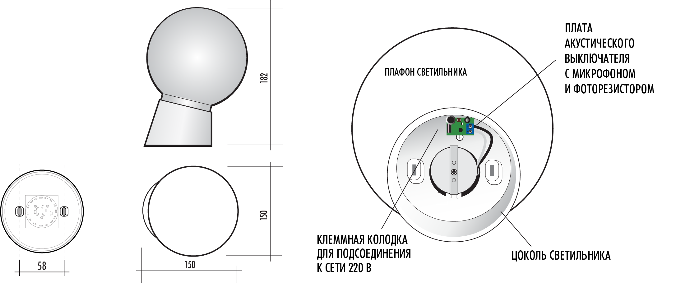 Светильник выпускается со встроенной платой акустического выключателя закрепленной на тыльной стороне пластмассового корпуса цоколя светильника настенного, либо потолочного крепления. Светильник полностью готов к работе. Подключить провода от сети 220 вольт к клемме на плате регулятора и к патрону.