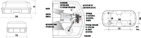 Выпускается со встроенной платой фотореле. Разберите светильник и подсоедините провода от сети 220 В к клемме "СЕТЬ" и от клеммы нагрузка к патрону лампы..