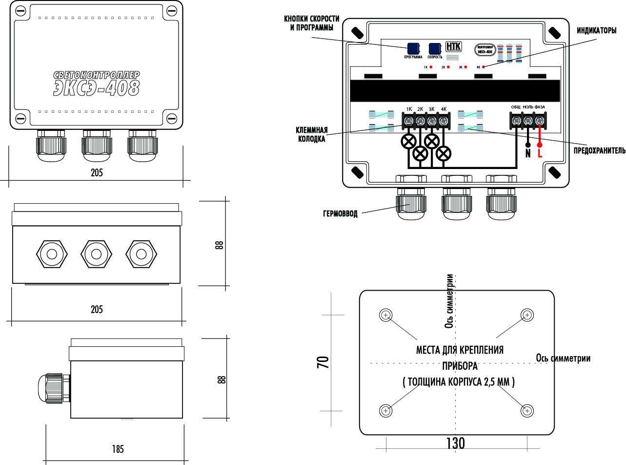 Контроллер выпускается в герметичном корпусе с присоединением проводов питания и коммутируемых электрических цепей через гермовводы.