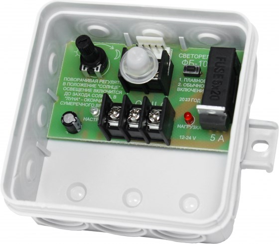 Поверните регулятор в крайнее положение «луна» и вращайте в направлении «солнце» настройка. Индикация сигнализирует о затемнении сенсора и включенной задержки. По истечении задержки светодиоды горят, включается нагрузка. Дальнейшей регулировки не требуется, прибор будет работать в автоматическом режиме. Для изменения выходного сигнала на плавное или мгновенное включение предусмотрена кнопка на плате прибора.
